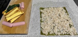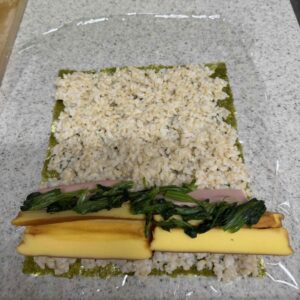 はじっこに材料をのせて。さて、巻き巻き~~、巻き巻き~~
