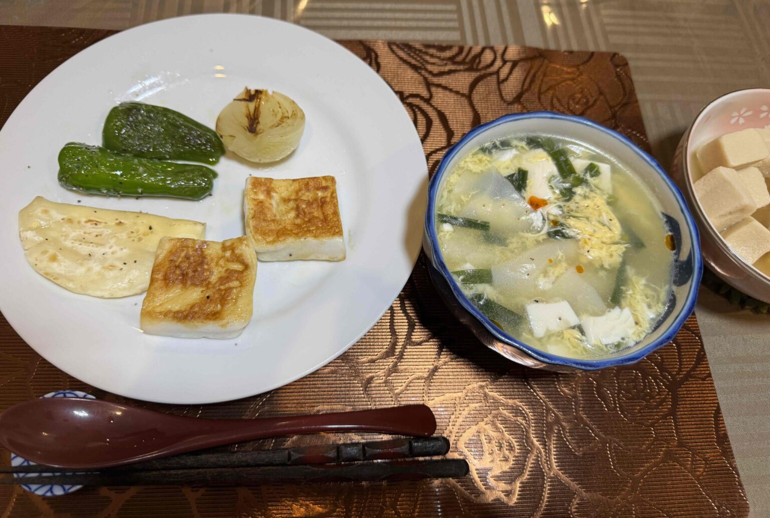 ※写真はいつかの夕飯 色々焼いたの 中華スープ 高野豆腐の煮物