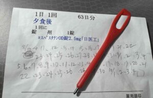 私は薬の入っている紙袋に、「リアル謎解き」のときもらった鉛筆を挟んでおき、飲んだらすぐに日付を記入することにしています。