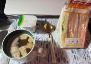 今朝は私が寝ている間に買いにいってくれたみたいです。サンドイッチ。ヨーグルト。オニオンスープ(お湯入れるやつ)。これらを部屋の外の廊下に準備してくれてます。