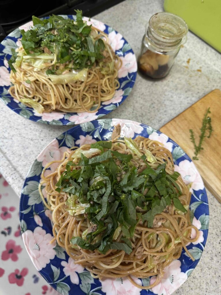 ※写真は今日のランチ(キャベツとシーチキンのパスタ 庭の紫蘇のせ。夫君は有給休暇)