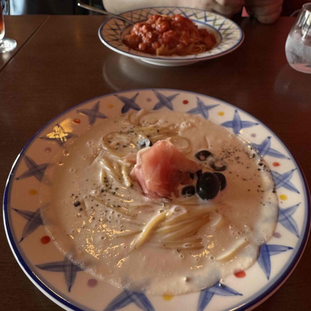 ※写真は昨日の日曜日のランチです。手前のクリームパスタ(生ハムとオリーブ)は私。すごく美味しかった✨奥は夫で、ベーコンのパスタ。