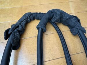 さっそく、トートバッグの2本のショルダーの肩に触れる側に4個ずつ貼り付けました。肩にかけ、体を傾けてみると落ちてきません!